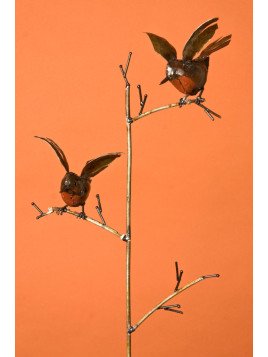 Tuteur doté de 2 rouge gorge sur arbre fabriqué artisanalement en métal recyclé
